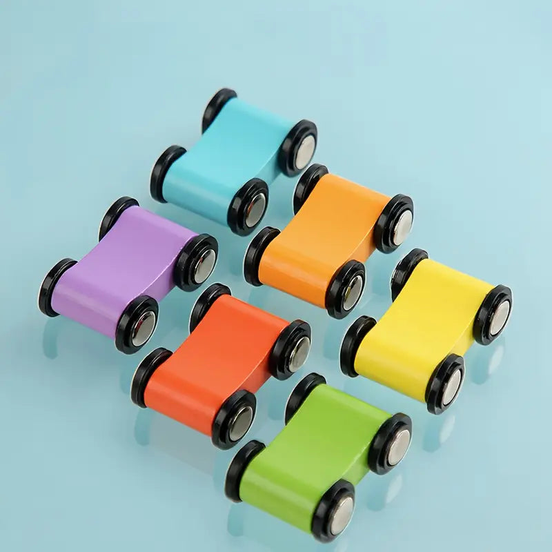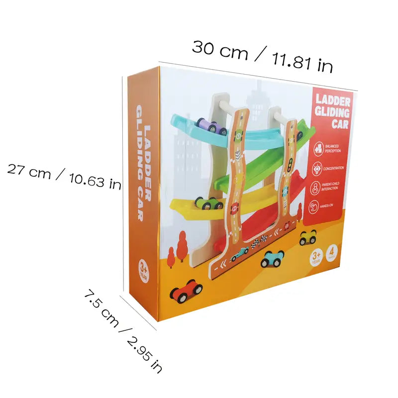 Set sadrži 4 mini autića i višeslojnu stazu u veselim bojama koje podstiču razvoj motorike, koordinacije i logike kod djece.