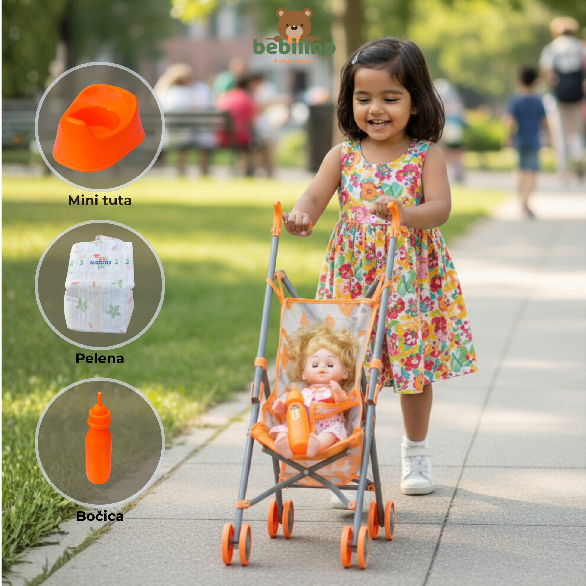 Djevojčica može šetati svoju lutku u laganoj, sklopivoj kolicima živih boja, savršenoj veličini za male ruke.